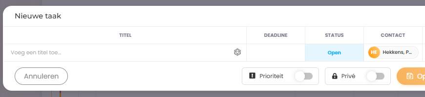 Maak taken alleen zichtbaar voor jezelf met de optie ‘Privé taak’. Handig voor persoonlijke notities, voorbereidingen of vertrouwelijke acties. Alleen jij ziet ze, maar ze blijven netjes onderdeel van je planning.